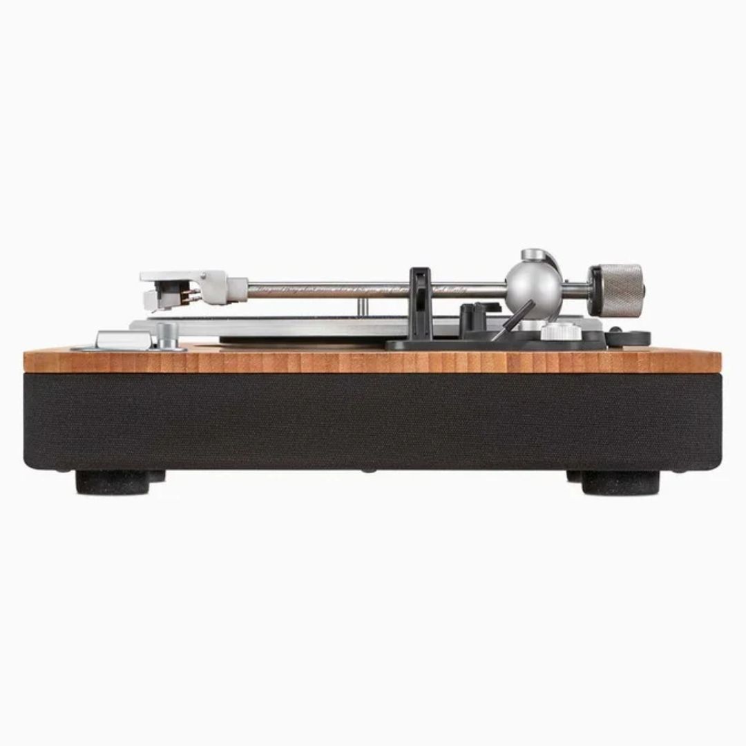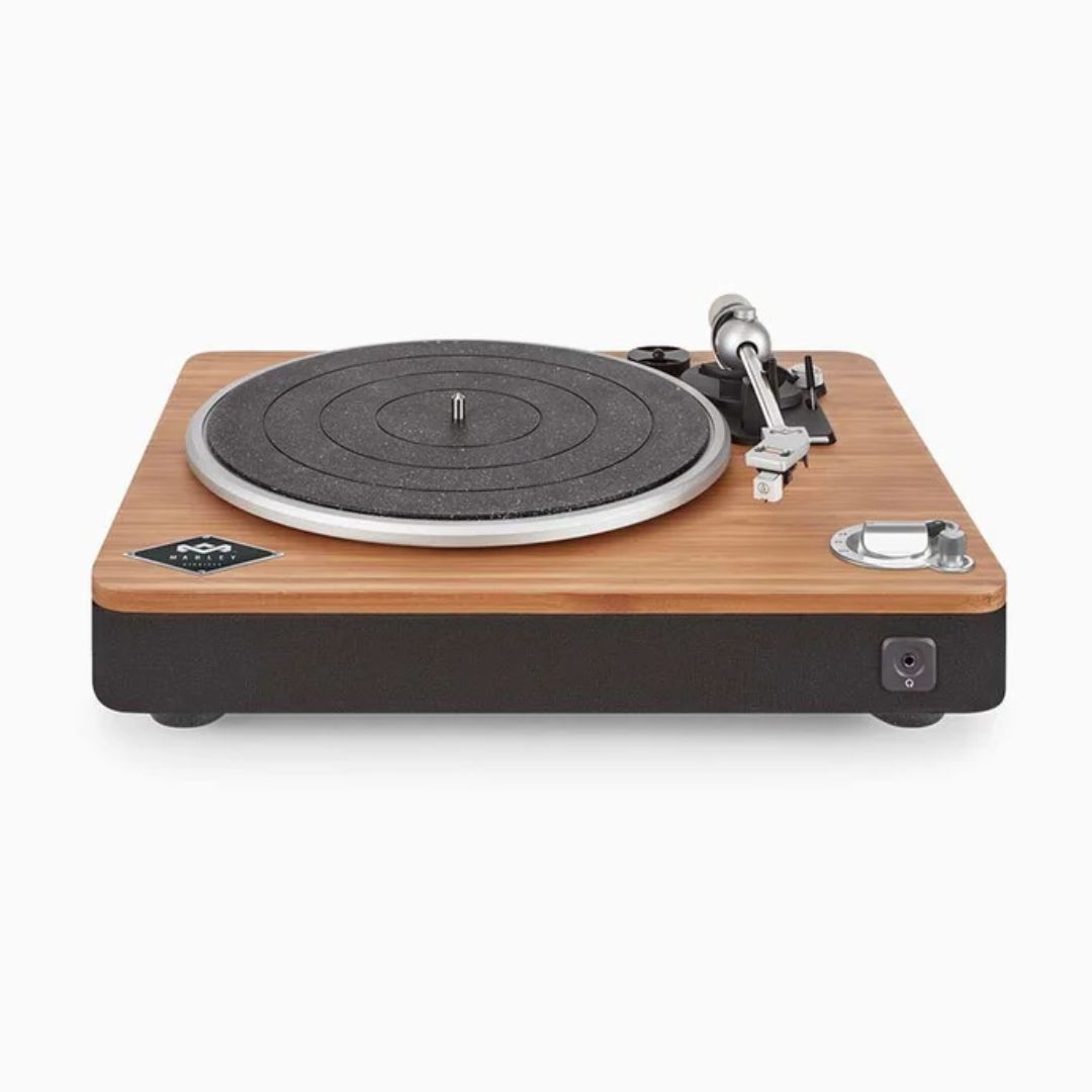 The House of Marley Stir It Up Wireless Turntable also stands out for its sustainable design. It uses REGRIND silicone, REWIND fabric, recycled plastic, and recyclable aluminum. The warm bamboo finish makes it an attractive centerpiece in any room, while unique details—like the Bob Marley quote engraved on the tonearm—add personality and charm.