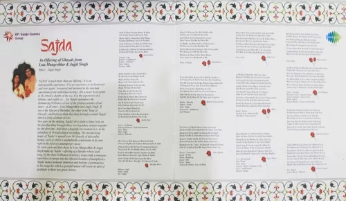 | Sajda is a Ghazal album released by HMV and jointly collaborated by Jagjit Singh and Lata Mangeshkar. This album was released in 1991 shortly after the demise of Jagjit Singh’s son Vivek. | |